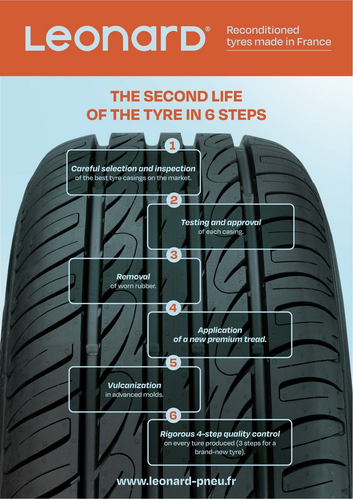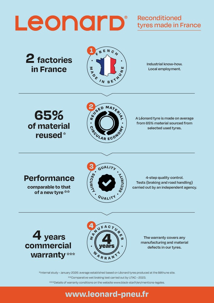 On average, 65% of each Leonard tyre comes from carefully selected used tyres (internal analysis 2026 based on the production from the Béthune site).
